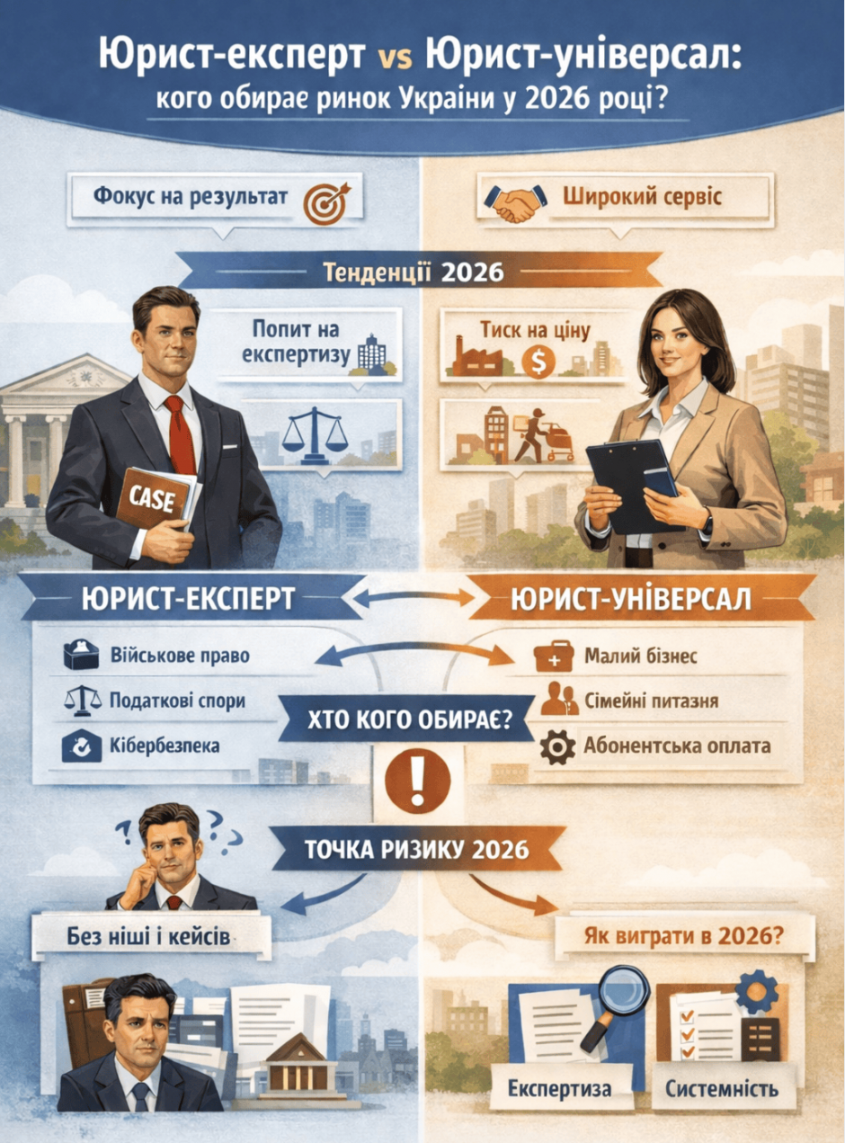 Саме тому протистояння юриста-експерта та юриста-універсала — це не теоретична дискусія, а питання виживання та масштабування у 2026 році.